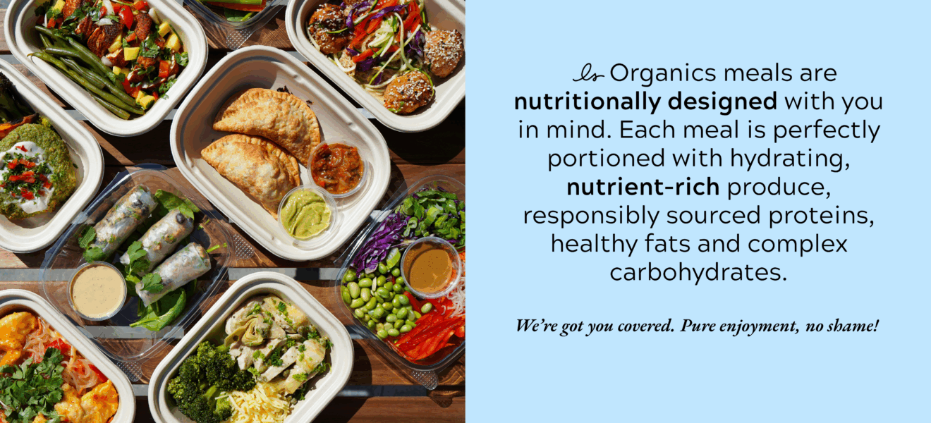 Organics meals are nutritionally designed with you in mind. Each meal is perfectly portioned with hydrating, nutrient-rich produce, responsibly sourced proteins, healthy fats and complex carbohydrates