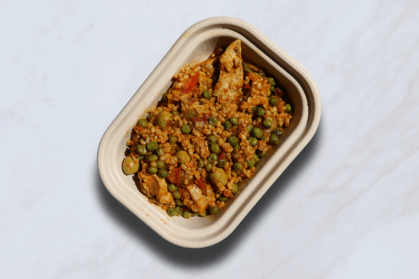 chicken, brown rice, turmeric, peas, onion, tomato, bell pepper, olives