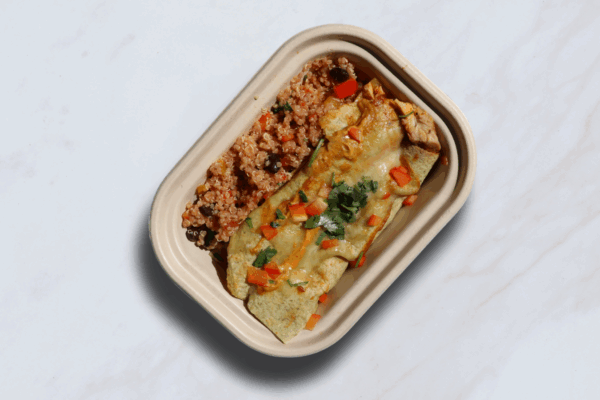chicken, gluten free wrap, onion, cilantro, bell pepper, tomato, black beans, quinoa, cheddar cheese, cashew, chipotle pepper, buffalo sauce