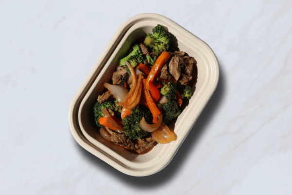 sirloin, brown rice, bell pepper, onion, carrot, broccoli, tamari, olive oil, pink salt, garlic, ginger
