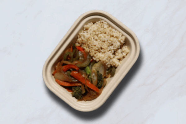 vegetables (varies), brown rice, bell pepper, onion, carrot, broccoli, tamari, olive oil, pink salt, garlic