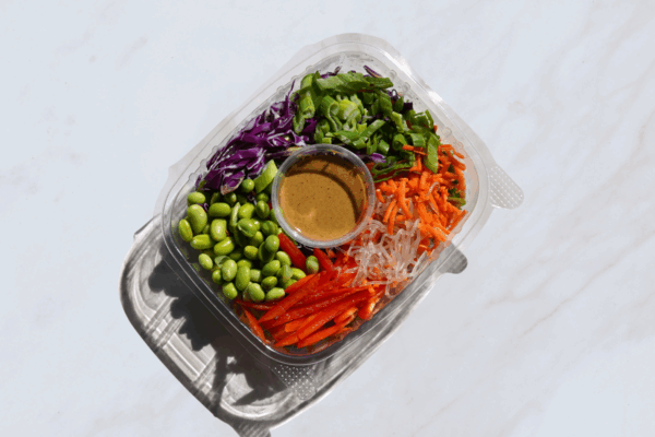 kelp noodles, cabbage, bell peppers, carrots, scallions, edamame, almond butter, tahini, lemon, tamari, ginger
